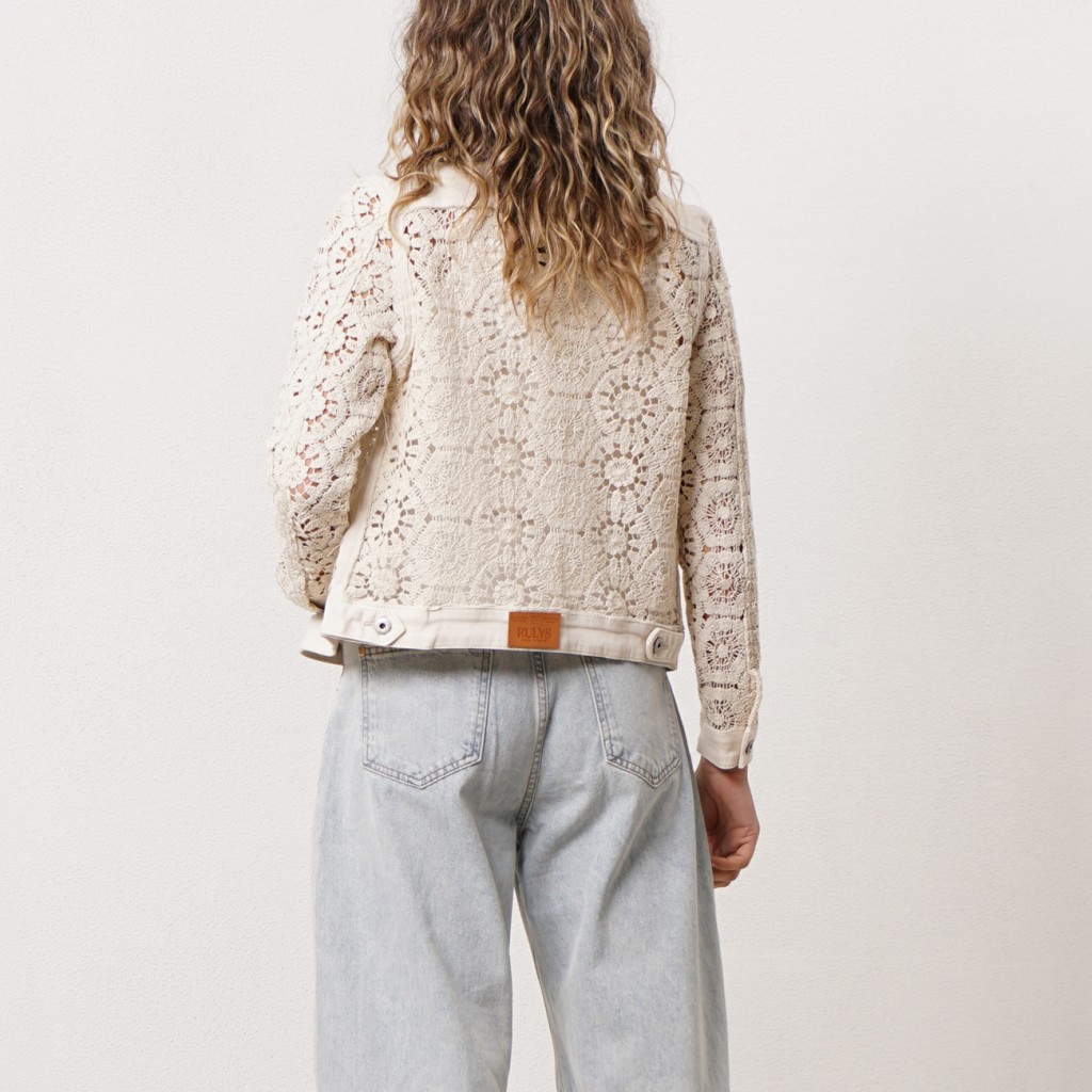Cowboy denim jacket with crochet appliqué