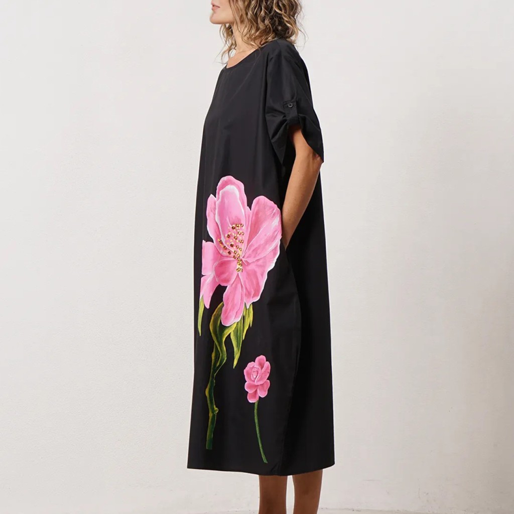 Cotton dress with floral print and sparkly appliqués
