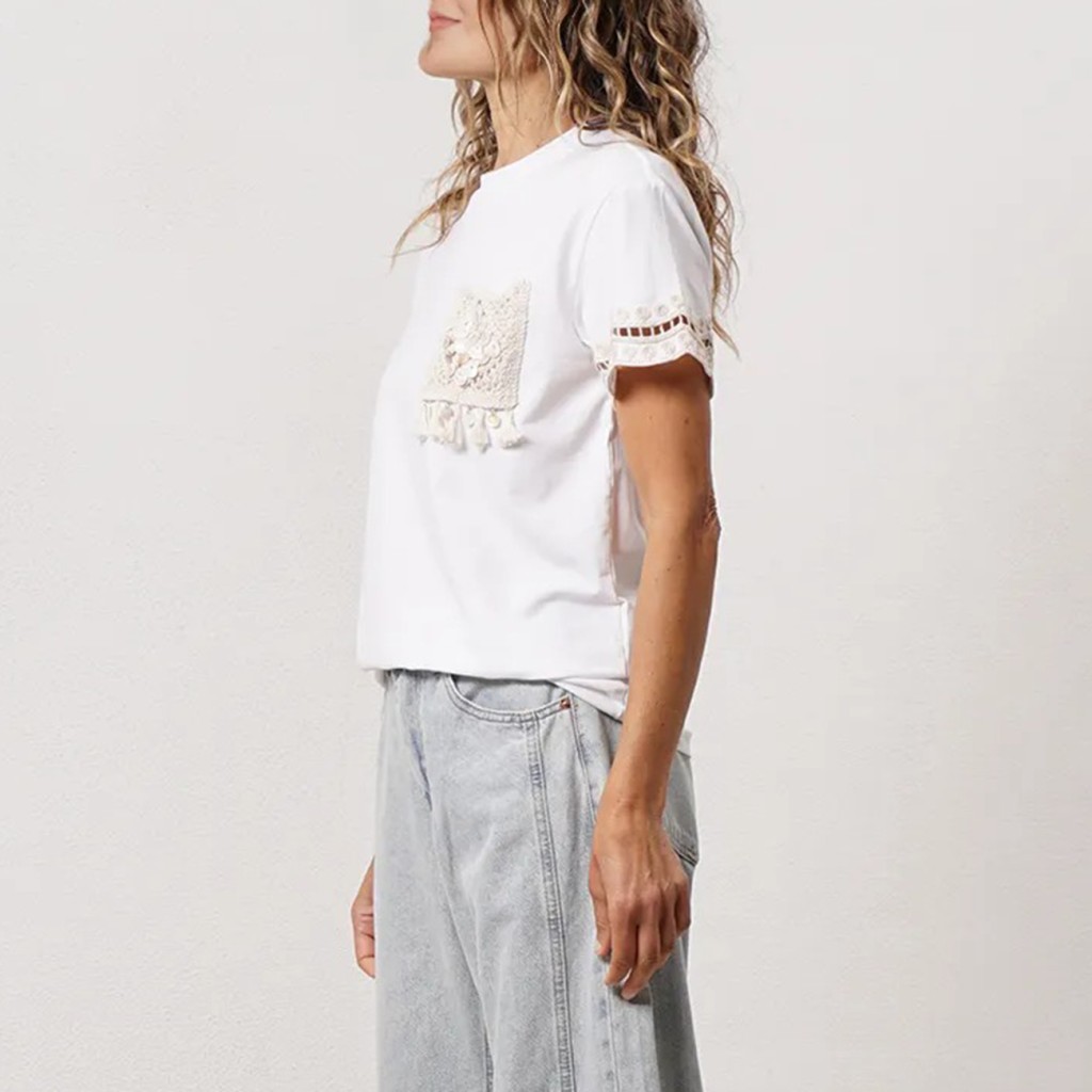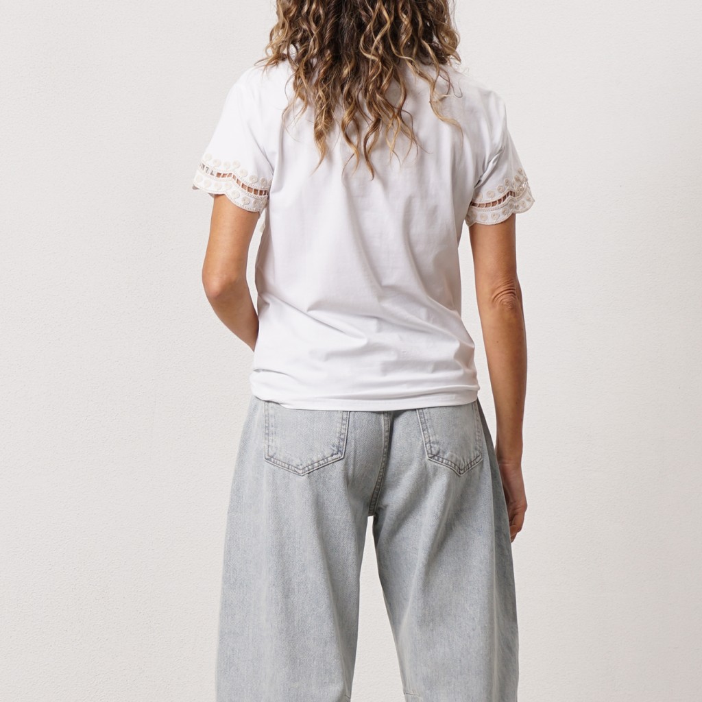 Cotton t-shirt with lace on the sleeves and knitted pocket appliqué Cotton t-shirt with lace on the sleeves and knitted pocket appliqué Cotton t-shirt with lace on the sleeves and knitted pocket appliqué Cotton t-shirt with lace on the sleeves and knitted pocket appliqué Cotton t-shirt with lace on the sleeves and knitted pocket appliqué