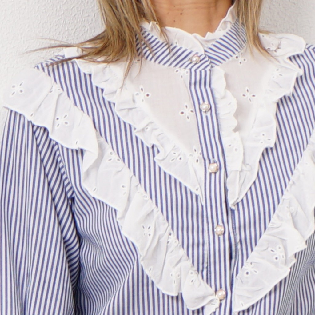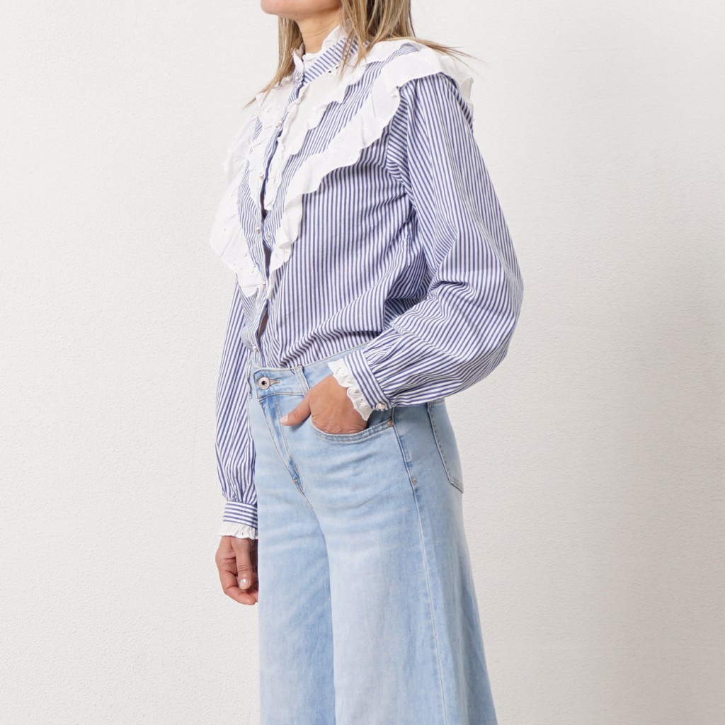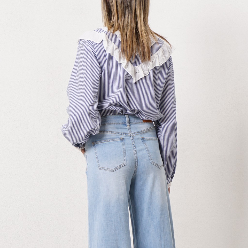 blusa de riscas c/ aplicação de folhos (Bordado Inglês)