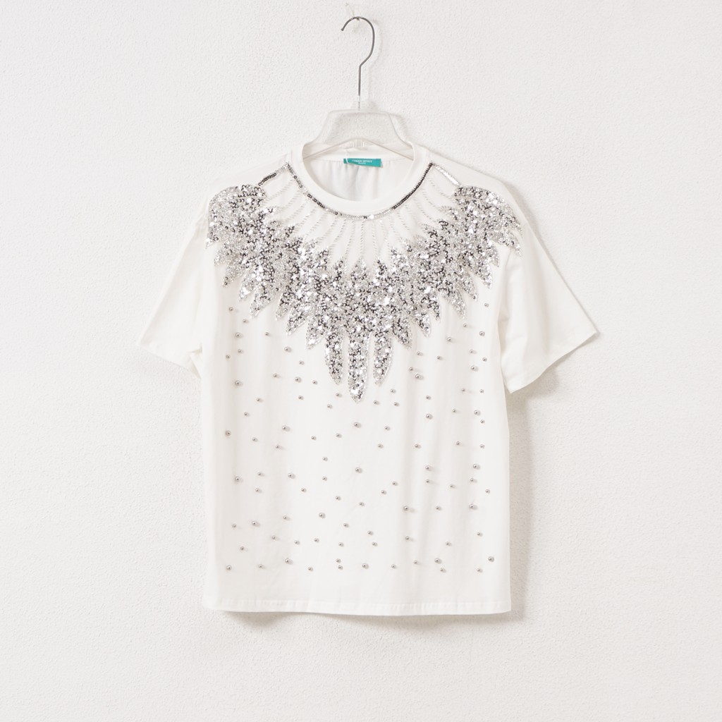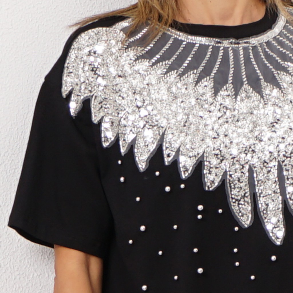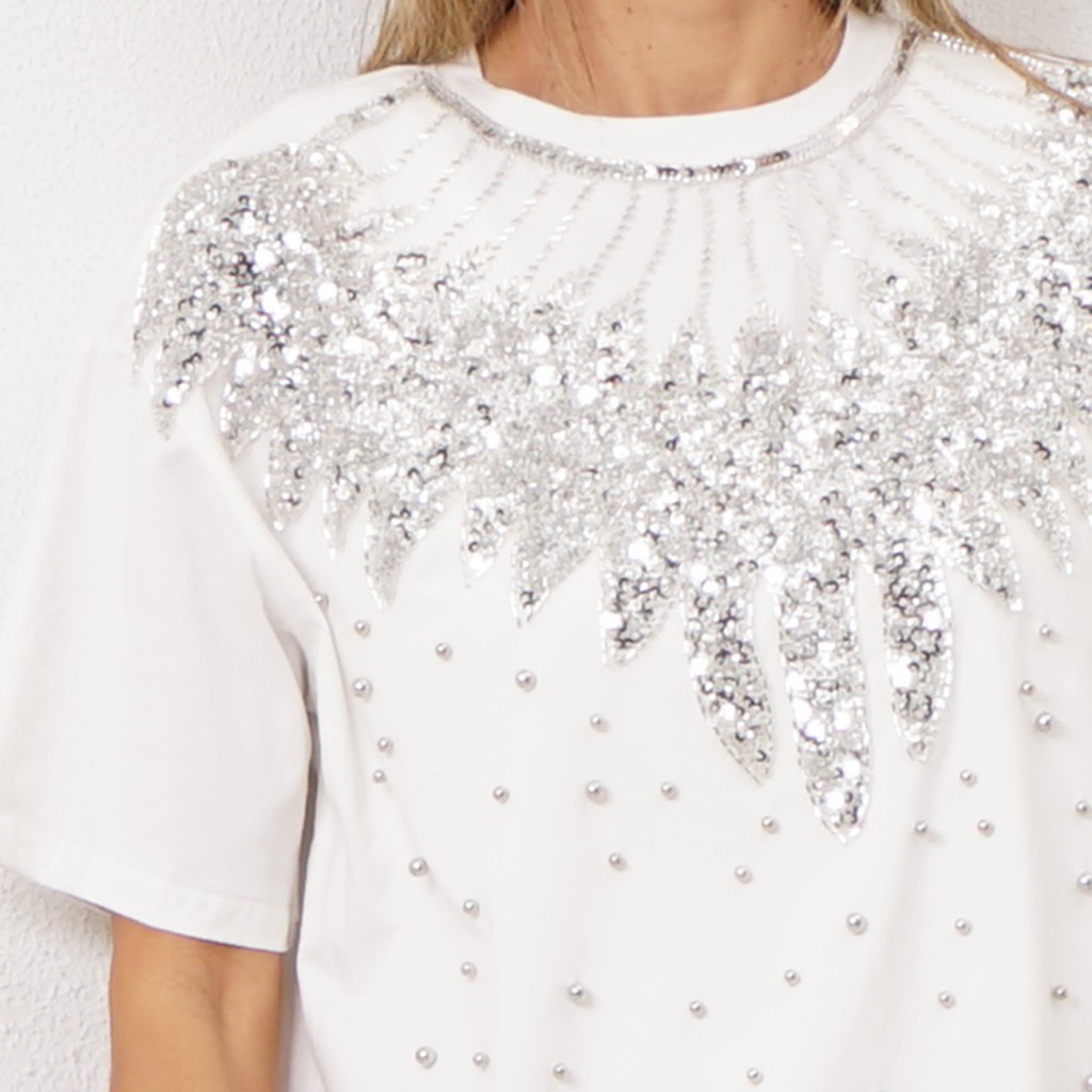 tshirt c/ aplicação de missangas, lantejoulas e bolas (premium)