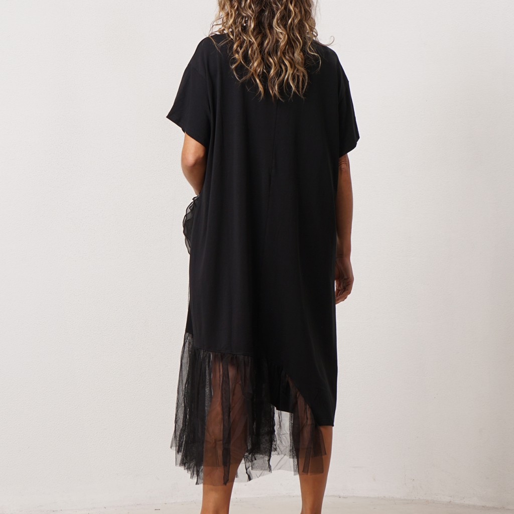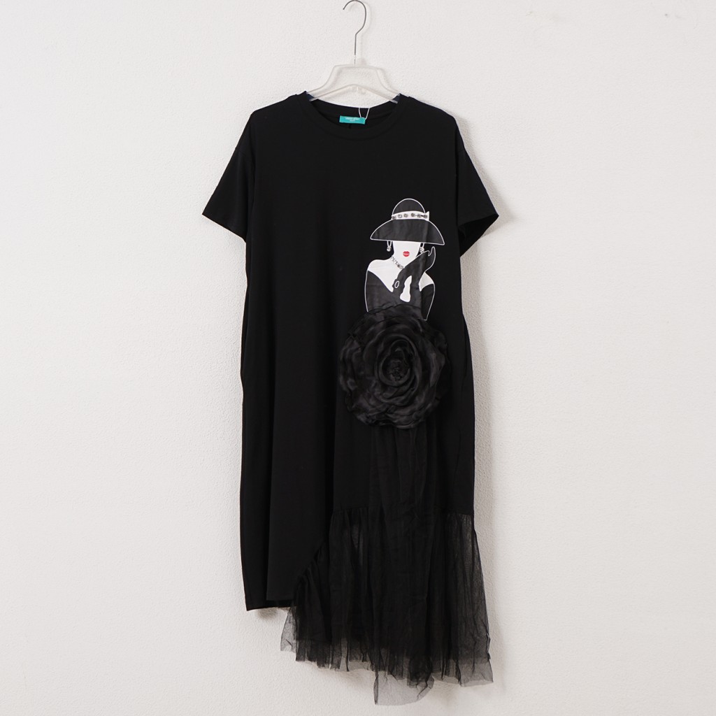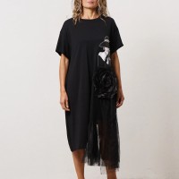 vestido m/ manga c/ estampa e aplicações assimétricas
